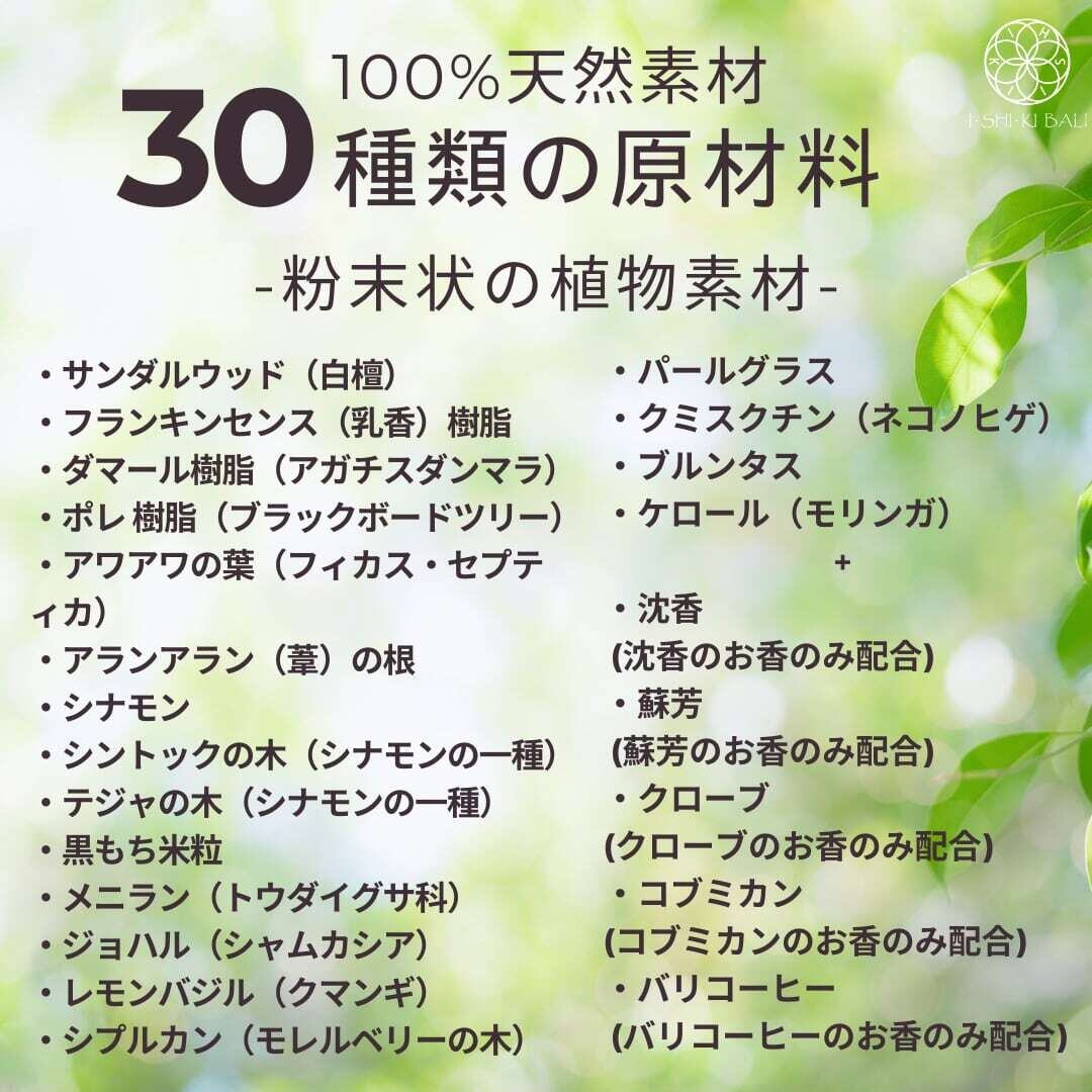 ISHIKI-BALIのお香は、漢方由来の天然素材100%で仕立てています。